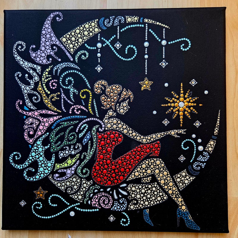 Elf is gemaakt met een mal. De ondergrond is al gekleurd met aquarelpotloden waar later ook de stippen op zijn bewerkt. Toen het klaar was zijn de achtergrondkleuren weer verwijderd. Dit is om niet in de war te raken omdat er veel vakjes zijn die gedot kunnen worden. Als extra is dat de sterren steentjes hebben zodat het echt fonkeld.