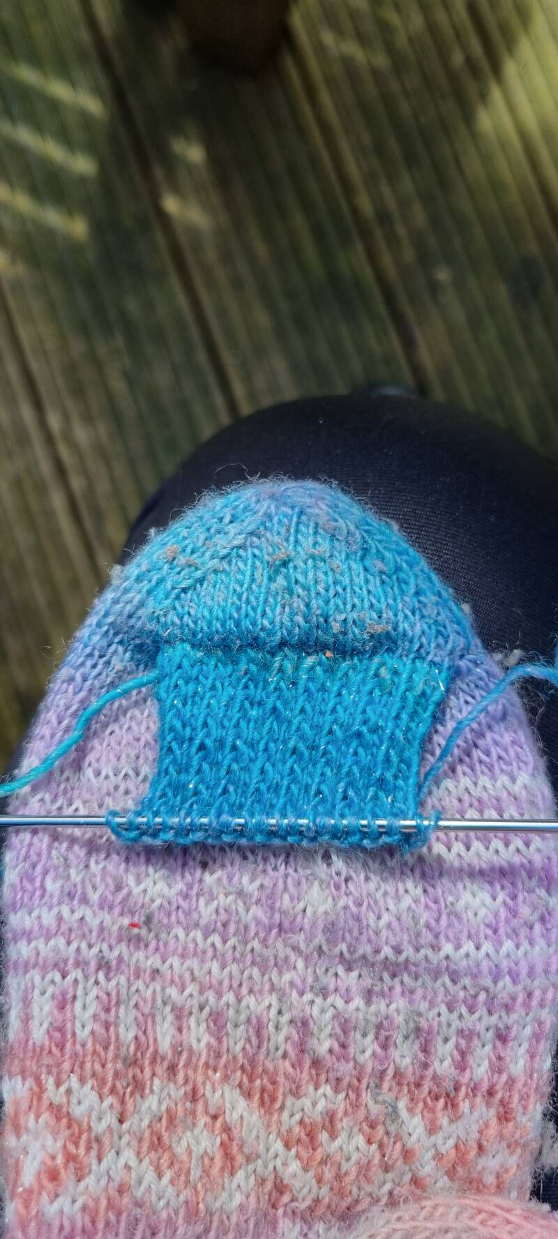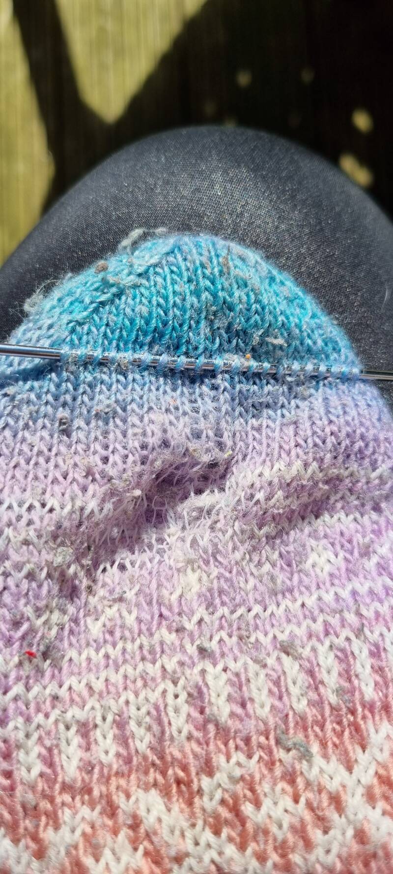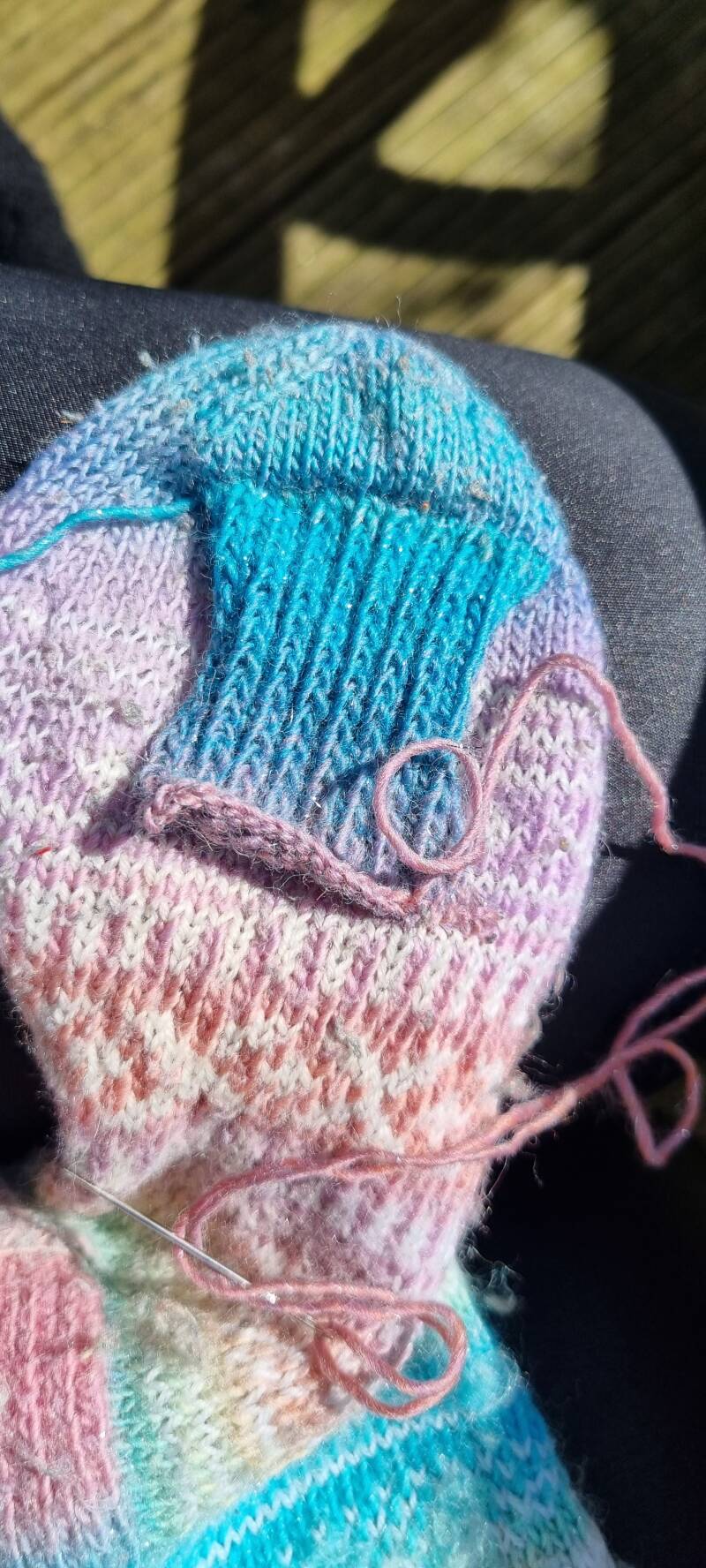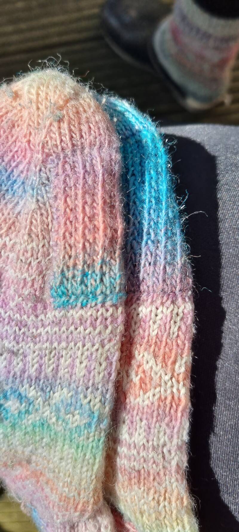 Ik heb sokken die al meer dan 7 jaar meegaan. En daar ga je natuurlijk wel wat slijtage aan zien. Dan pak ik mijn paddenstoeltje om het te stoppen. Lekker ouderwets maar doeltreffend. Soms is een sok ter ziele, zo lijkt het. Zo kreeg ik de vraag van een klant of ik nog een paar sokken in haar maat had liggen. Haar sokken waren onder haar voet goed versleten. Joh, zal ik eerst kijken of ik je oude sokken kan reanimeren? Zo geschiede. Ook sokken krijgen reservetijd. Ze kan ze weer een tijdje dragen.