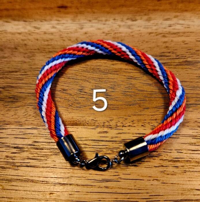 Deze armbanden zijn gemaakt met zelfgesponnen schapenwol. Althans, de natuurkleuren. De armbanden met een kleurtje is ook 100% schapenwol alleen heb ik deze niet gesponnen.
