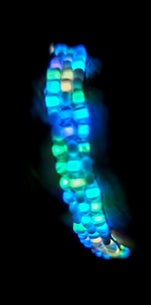 Deze armband is ook gemaakt met seed breadkralen. Het verschil zit hem in een ander manier van dragen. Zoals je op de foto ziet draag je het slotje aan de bovenkant en is de armband op maat gemaakt. Op de foto heb ik haar 3 kraals breed gemaakt. Maar ook dat kan naar wens gerealiseerd worden. De kraaltjes van deze armband lichten op in het donker oftewel, glow in the darkkraaltjes.