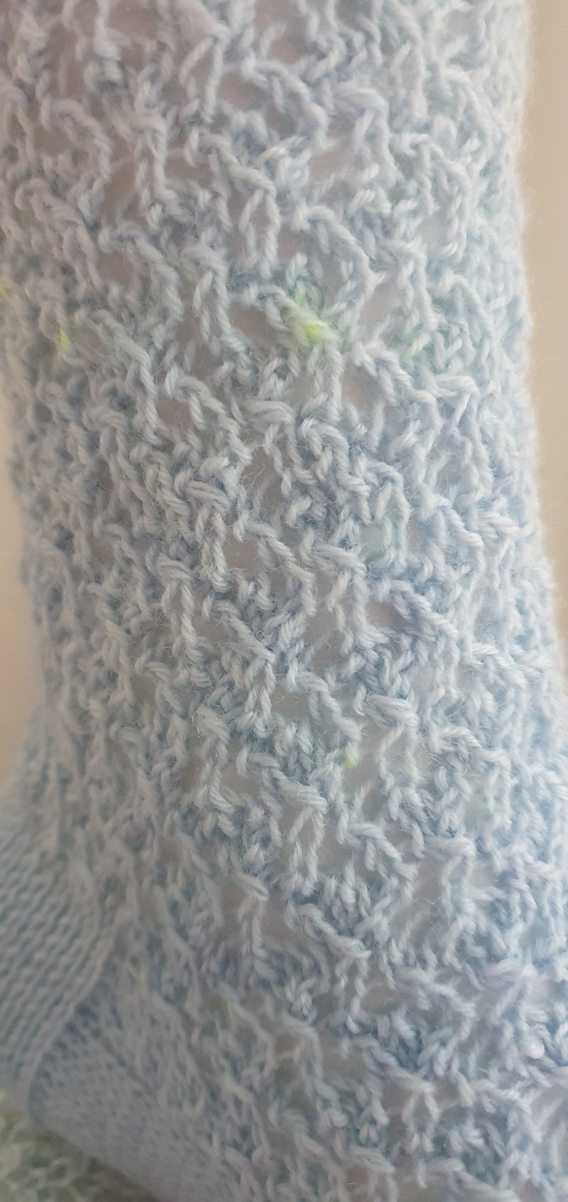 En dan is het zomer. Seizoen met blote voeten, slippers en sandalen. En.... luchtige sokken voor in wandelschoenen. Hull is gemaakt met wol wat goed vocht opneemt en enkel is gebreid. Daar bedoel ik mee dat er geen draadjes aan de binnenkant zit wat je wel hebt bij de Noorse sokken. Deze sokken zijn uniek. De ene sok begint met mintgroen en eindigt met zachtblauw. De andere sok andersom, dus zachtblauw naar mintgroen.